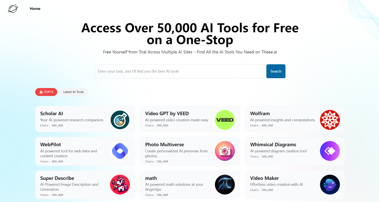 π Introducing Theee.ai β Your Ultimate GPTs AI Tool Hub πWelcome to Theee.ai, the largest platform for accessing and utilizing AI tools online, free of charge. With over 50,000 AI tools at your fingertips, you can boost your productivity and efficiency effortlessly.π§ π‘ Why Choose Theee.ai?- No Cost, No Sign-up: Enjoy powerful AI tools without any fees or registration.- Vast Collection: Explore and utilize more than 50,000 AI tools in one place.- Easy Access: Browse, search, and use AI tools directly on our platform without the need to register on multiple sites.- Diverse Range: Find specialized AI tools for different needs and industries, perfect for professionals, students, and enthusiasts.- Advanced Technology: Powered by OpenAI's latest GPT-4o model and industry-specific APIs, ensuring top-notch performance.-Time-Saving: Eliminate the hassle of searching multiple websites and managing various accounts.πΌ Join us at Theee.ai and revolutionize the way you use AI tools.