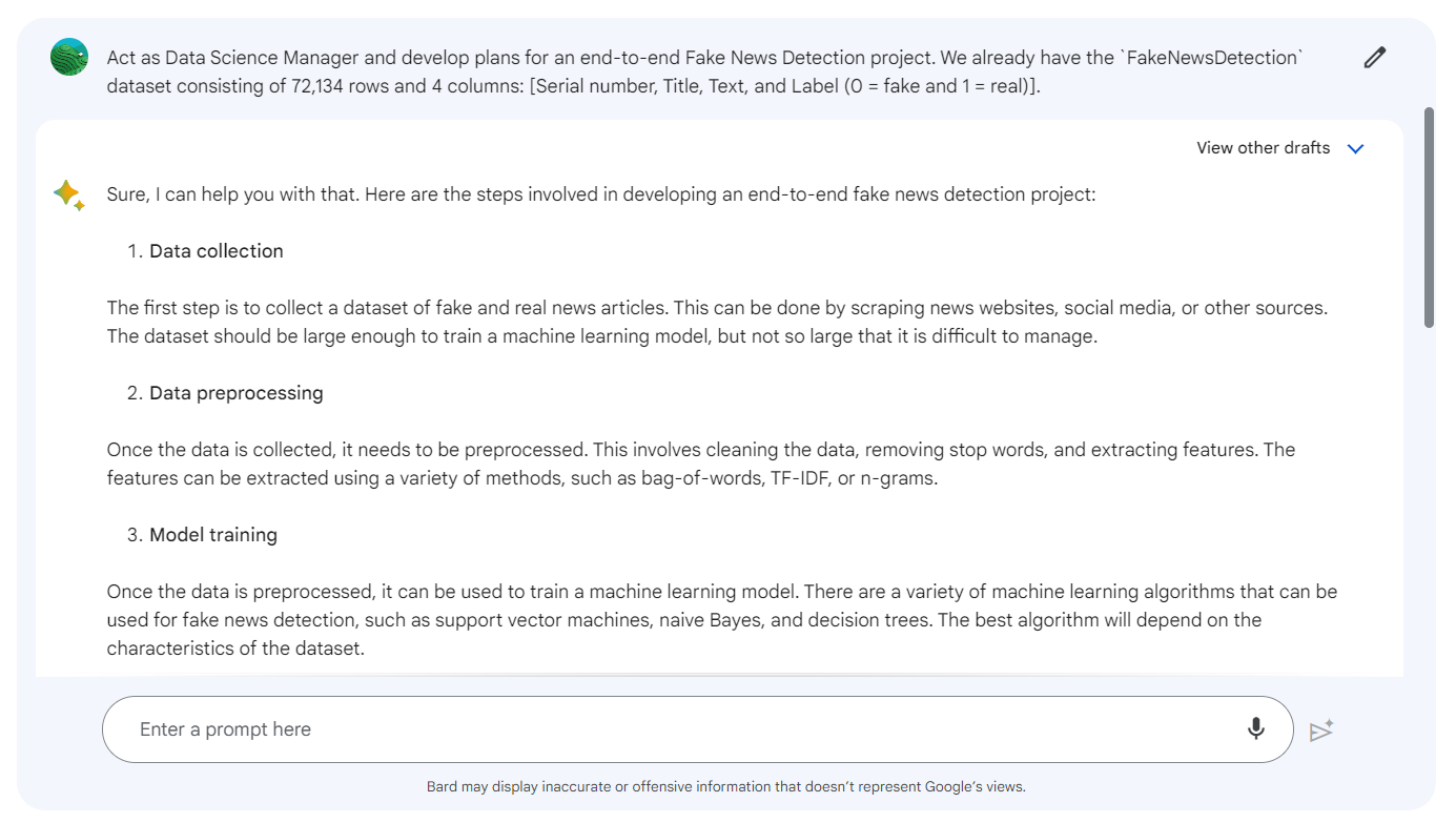 Prompt: “Act as Data Science Manager and develop plans for an end-to-end Fake News Detection project. We already have the FakeNewsDetection dataset consisting of 72,134 rows and 4 columns: [Unnamed: 0, title, text, and ;abel (0 = fake and 1 = real)]