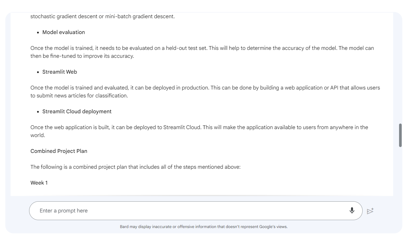To create a project outline, we will craft a detailed prompt for Bard that includes all relevant information about the development of our Fake News Detection application. It will include key details, such as the dataset we will be using, which is the Fake News Classification dataset from the WELFake paper, as well as any project directives that will guide our team throughout the development process.