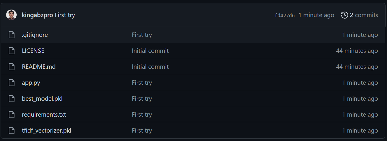 2. Add the files using Git, commit, and push to the external server. Make sure you have added model, vector, app.py, and requirements.txt.