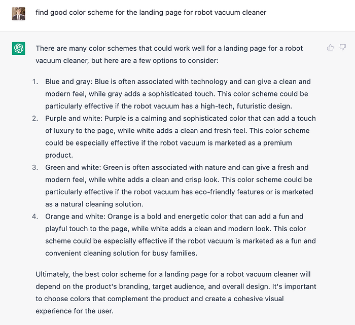 Visual exploration is not something that you expect from a text-based tool. You might say that it’s better to do the exploration in tools like midjourney or Dalle-2, and I will agree with you. But I wanted to know how ChatGPT can handle prompts like “Find a good color scheme for [something].” The tool provided a few recommendations on color selection without specific details, such as actual HEX colors. I think the output can be a good starting point for visual designers and give them strong arguments regarding the colors they want to use.