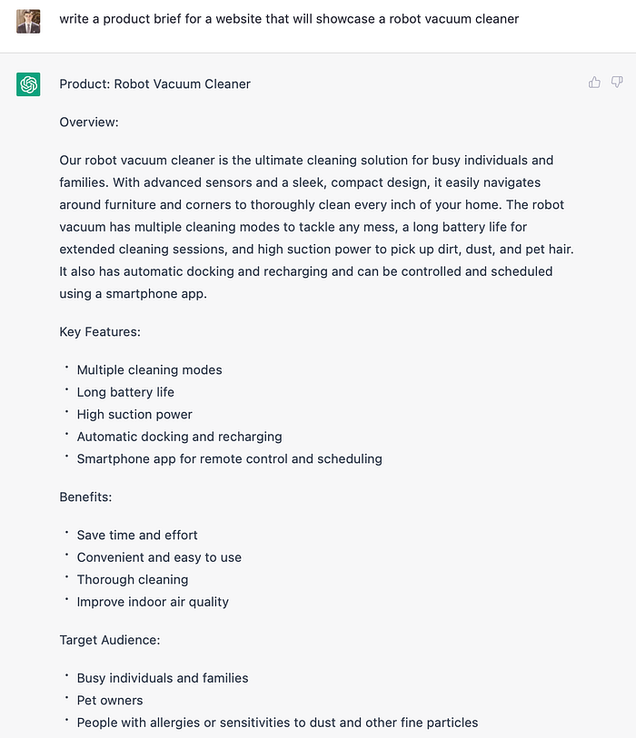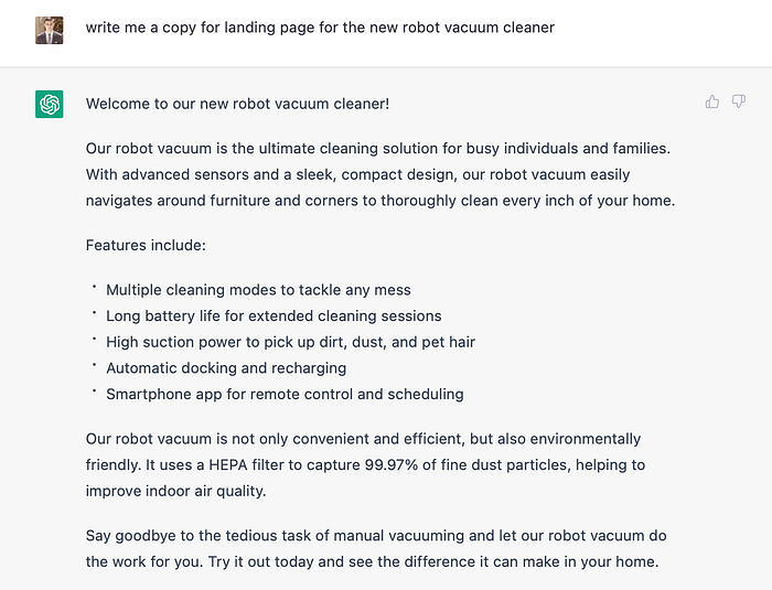 I’ve already discussed what this tool is capable of, but in this article, I want to explore how product creators can make the most of this tool. I will use ChatGPT to create assets for the new website (a landing page for a robot vacuum cleaner) — eight practical tasks in total, along with my impression of how well ChatGPT can deal with them.
