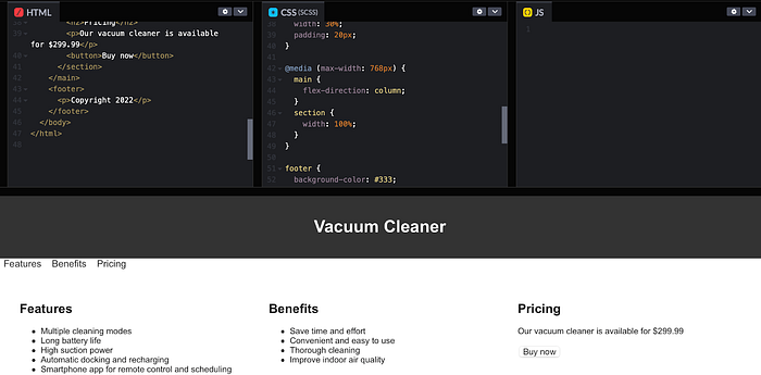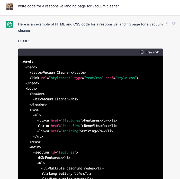 What if you want to create a coded prototype of a web page? Most of the time, you either rely on ready-to-use templates or create something from scratch using one of the popular web frameworks like Vue. But can ChatGPT help us with that? When I asked the tool to write code for a responsive landing page, the tool created a very simple responsive web — it provided both HTML and CSS source code.