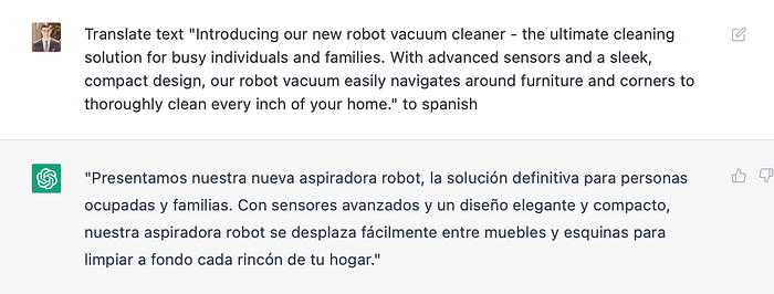 Let’s assume that the website we create will be available in two languages — English and Spanish. It means that we need to translate our English copy into Spanish. GPT is a large language model, and language translation was likely one of the first practical tasks that it was used for. So it’s easy to assume that the tool can easily translate text on the page from one language to another. Surprisingly, the translation result was average — the translated copy sounds a bit rough and robotic. Google Translate was able to handle this task much better than ChatGPT.