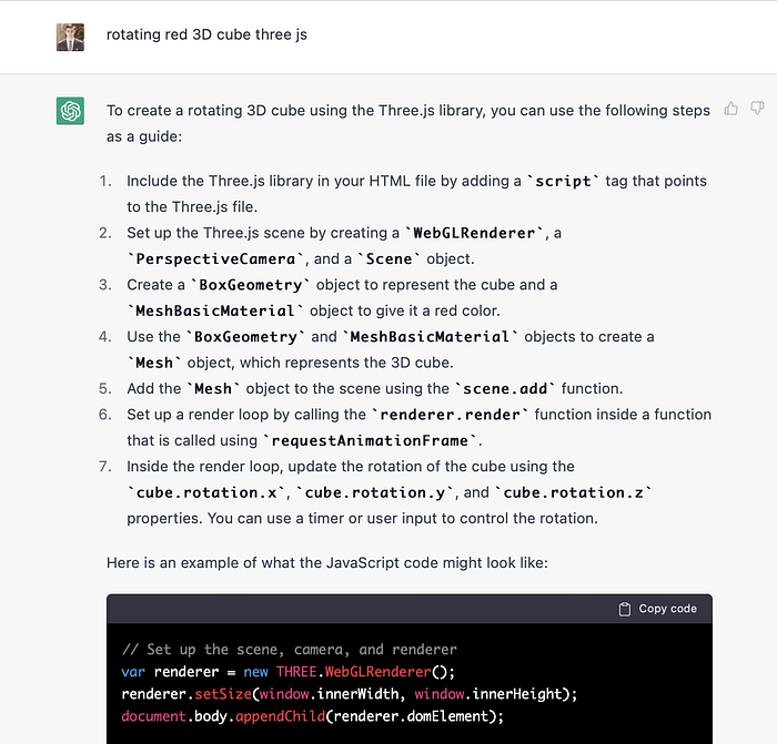 You may assume that ChatGPT is bad at writing code, but it’s not true. In fact, there are a few cases when ChatGPT can show impressive results. For example, I’ve asked ChatGPT to generate a code for the rotating cube that I could use for the website. It generated a code in less than a minute, along with a text description.