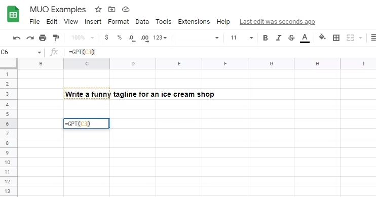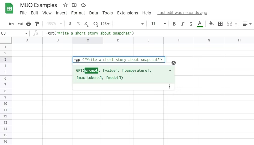 1. Generate TextWith GPT-powered Google Sheets, you can use regular ChatGPT prompts and get similar replies like you'd do with ChatGPT right within Google Sheets. For instance, if you want to populate cell C3 with a story about Snapchat, you could type the formula =GPT("Write a short story about Snapchat") right inside the cell.