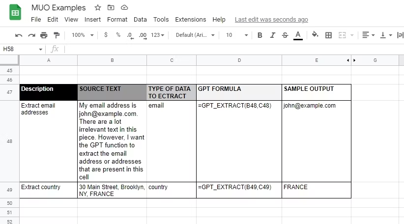 4. Extract DataIf you are working with a lot of mixed-up data or text, you can extract certain data types into assigned cells using the =GPT_EXTRACT function. For instance, you could paste a CSV file in, say, cell B23 and use =GPT_EXTRACT(B48, C48) to extract email addresses from the CSV text to the current cell. In the function, the C48 references a cell that contains the data type to extract, in this case, email addresses.