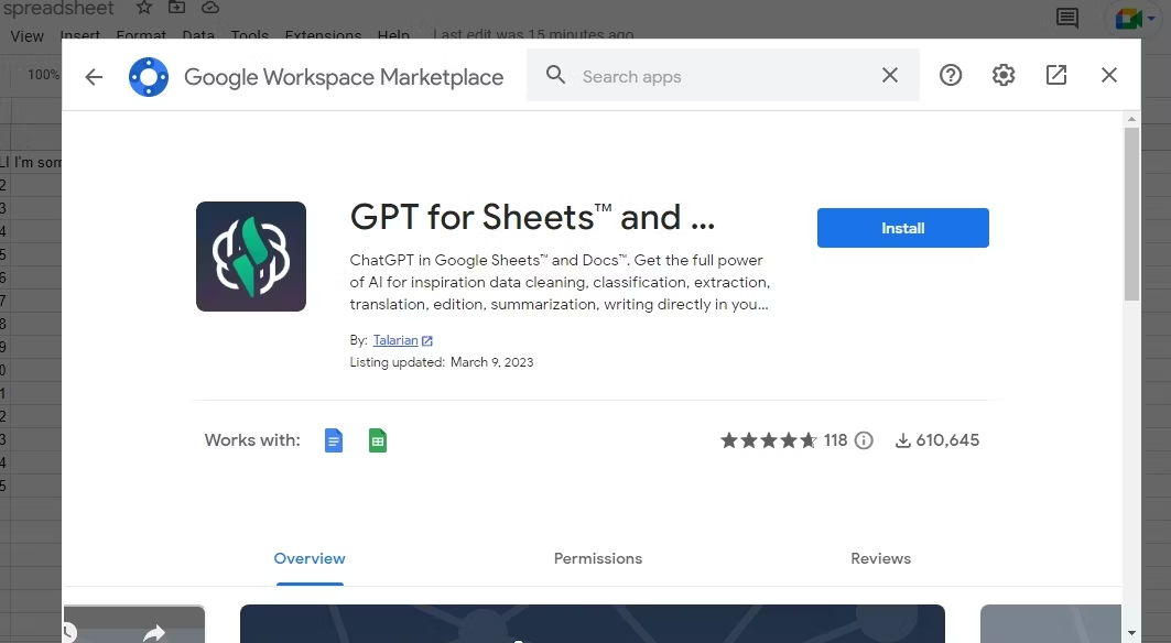 Although OpenAI does not have a ChatGPT extension for spreadsheet apps, you can still enjoy GPT technology within Google Sheets using third-party applications that interface with OpenAI's GPT API. One such third-party application is the "GPT for Sheets and Docs" extension. It is not a standalone app but a Google Sheets extension that makes it possible to use ChatGPT-like prompts wrapped in functions within your spreadsheets.