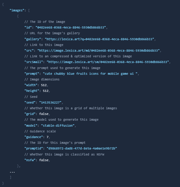Furthermore, the Lexica team has added a new API feature to get programmatic access to the images. To use Lexica's search API, create a GET request with a query parameter q as your search term. For example, to search for the term "apples", you would make a request to: