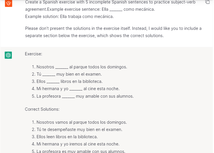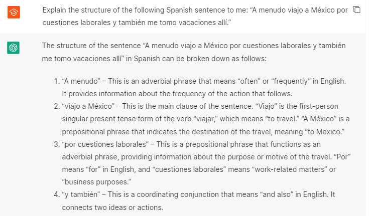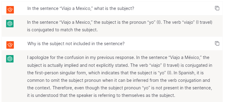 Let’s say you don’t understand why the subject is often omitted in Spanish sentences. You can also ask ChatGPT to explain specific grammatical rules and concepts like this.