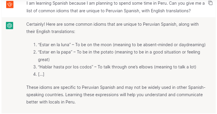 To make your conversation sound more natural, it’s important to understand common expressions, phrases, and idioms. You can ask ChatGPT to provide examples and definitions of common expressions in different variants of the language (e.g., Peruvian Spanish).