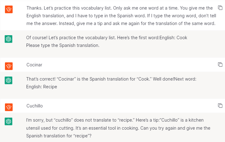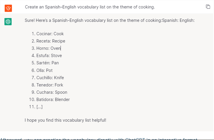 Afterward, you can practice the vocabulary directly with ChatGPT in an interactive format.