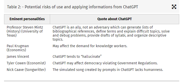 ChatGPT received positive reviews from the leading daily The New York Times, which considered this as the ‘best AI. This was endorsed by another popular newspaper The Guardian to generate ‘human-like text’.[14] Other experts also had given positive reviews about ChatGPT and considered this as smart enough despite its flaws. The co-founder of OpenAI Elon Musk himself has resigned in 2018.[15] Google CEO Mr. Sundar Pichai too had reassigned his teams to explore the counteractive measures to combat this large language model. Many consider that the most popular search engine Google is at threat if ChatGPT takes over and they can not improvise themselves with updated technology. A simulation exam paper was given to ChatGPT to solve in England and Wales, in which ChatGPT scored 42% (below PassMark 55%), which can be considered a reasonable attempt.[16] ChatGPT has the potential to be misused, so utmost digital privacy, vigilance and surveillance, ethical perspectives, and end-to-end encrypted security measures are necessary to combat the potential attacks by malware, software, and pirates in the dark web.[17] Some experts have commented and warned about the potential risks of using ChatGPT, as mentioned in Table 2.