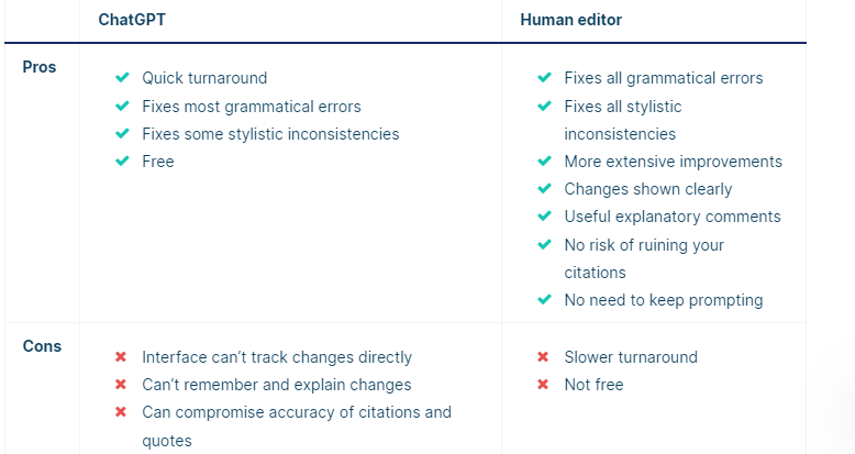 In terms of quality, ChatGPT can ensure basic correctness, but the human editor is better at improving fluency, clarity, and conciseness. ChatGPT’s tendency to create citation errors and modify quotations is also worrying. And it seems incapable of explaining the changes it made, struggling to even remember what it changed, let alone explain why.