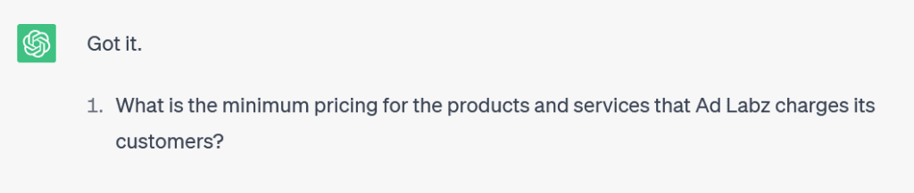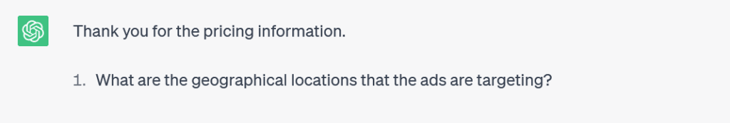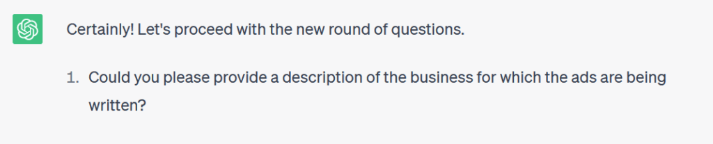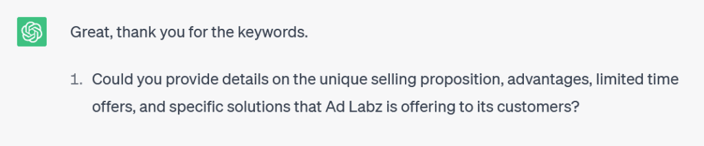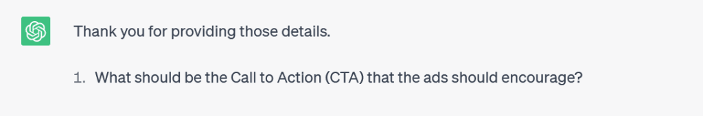 you’ll ask the first question about the description of the business for which the ads are being written. the second question will be about the keywords we are planning to target. the third question will be about the unique selling proposition, advantages, limited time offers and specific solutions the business is offering to its customers. the fourth question will be about the Call to Action that the Ads should encourage. The fifth question will be about the minimum pricing for the products and services that the business charges its customers. The sixth question will be about the geographical locations the ads are targeting.