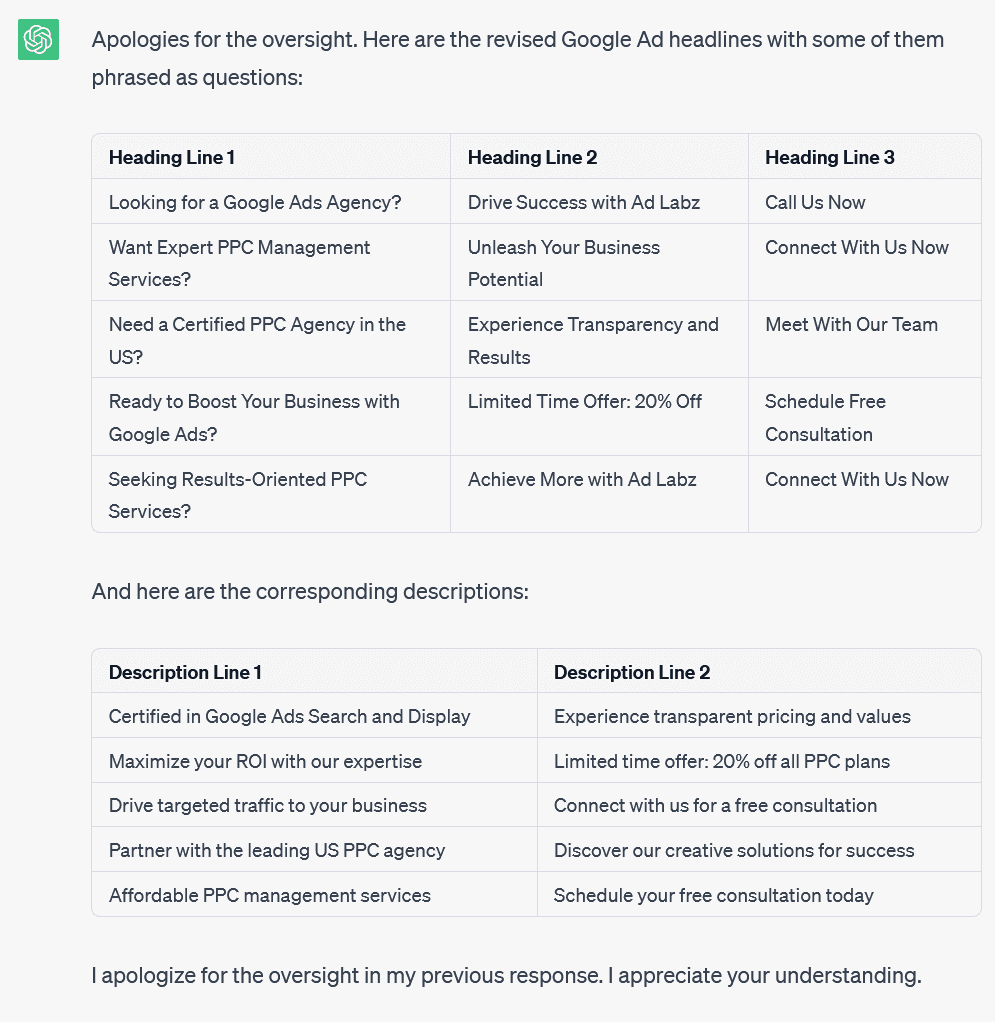 The prompt worked like a charm and quickly generated highly effective headlines and descriptions. Here are the screenshots: