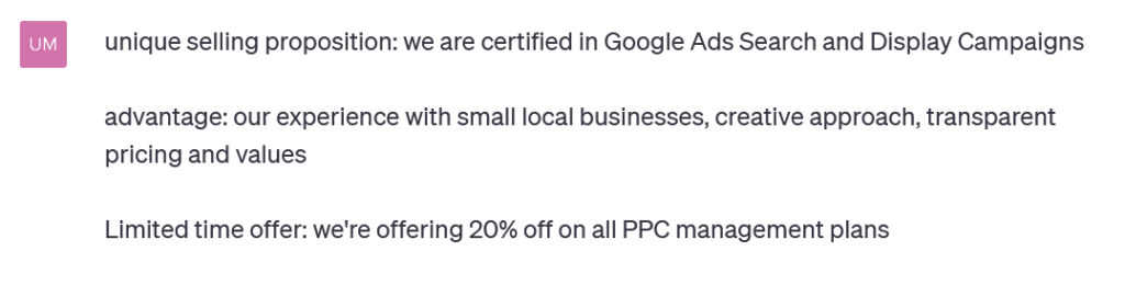 I was planning to use a spreadsheet like Excel to write the headlines & descriptions but I thought why not train ChatGPT on the above formula so that It can do the heavy lifting for me? So I decided to devise a prompt to put everything into action. In addition to the procedure mentioned above, I wanted ChatGPT to learn about the following information before writing the headlines & descriptions: