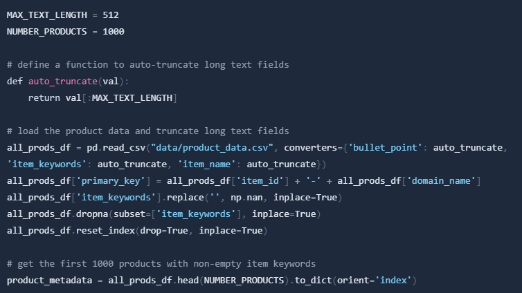 The next step involves loading Amazon product data into a Pandas DataFrame, and truncating long text fields to a maximum length of 512 characters, which is the maximum length supported by the pre-trained sentence embedding generator that we will be using later on.