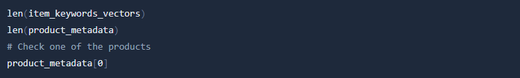 The code loads the product data from a CSV file, truncates long text fields, adds a new primary_key column to the DataFrame, filters out any products without keywords, and extracts the metadata for the first 1000 products with non-empty item keywords and stores it in a dictionary called product_metadata.