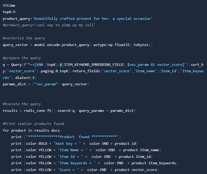 And after this we can query our index and search for the top 5 (topK) nearest neighbors for a given query vector: