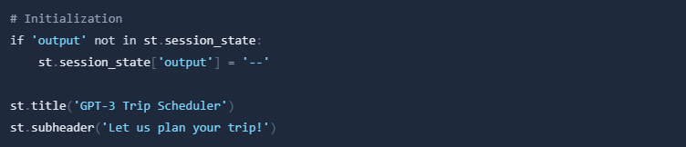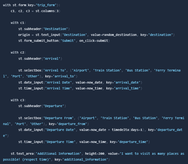 Now we can create our Streamlit app. First, we need to create a functions that will generate prompt and trip schedule based on user input: