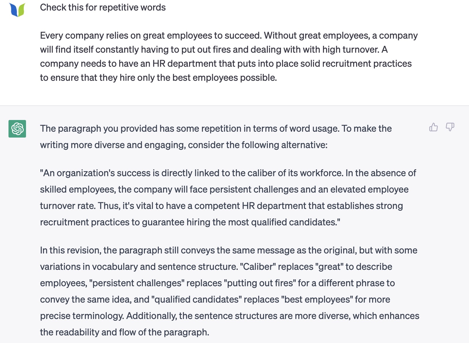 For example, if a writer uses a word that is too informal for the tone of their writing, ChatGPT may suggest a more formal or academic word that better fits the context. Likewise, if a writer repeats the same word too often in their writing, ChatGPT can suggest synonyms to help the writer avoid redundancy and diversify their vocabulary.
