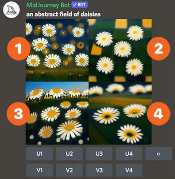 In the top row: U1, U2, U3, and U4 are buttons for Upscaling your selected image. Upscaling and image generates a higher resolution, roughly 1024x1024 image. By default, this also generates additional details