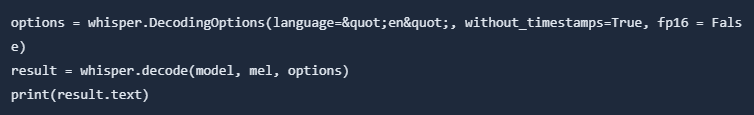 We transcribe the first 30 seconds of the audio using the DecodingOptions and the decode command. Then print out the result: