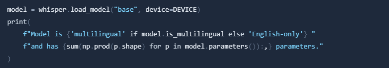 Now we can load the Whipser model. The model is loaded with the following command: