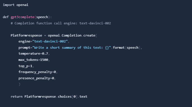 We will create a new file called gpt3.py and add the following code to it. In the prompt I was using the summary option to summarize the text, but you can use anything you want. And you can tweak the parameters as well.