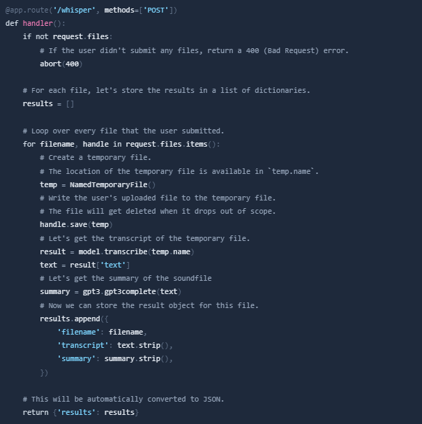 We will integrate our new GPT3 function into the route. So when we are getting the result from whisper we will pass it to the gpt3 function and return the result.
