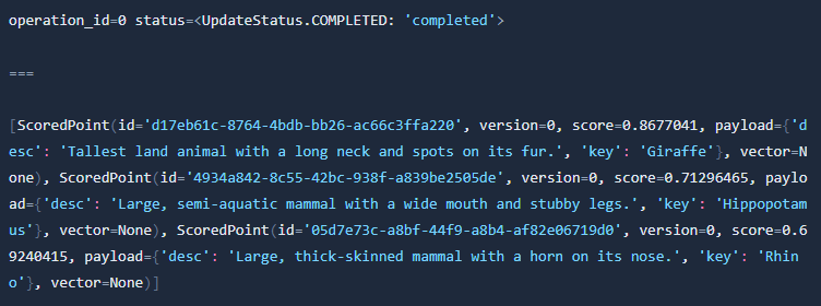 As you can see in 1st row: index operation went well. We got 3 results, as we defined. The 1st one is (as expected) a Giraffe. We also got Hippopotamus and Rhino. They are also huge, but I think Giraffe is the tallest 😆.