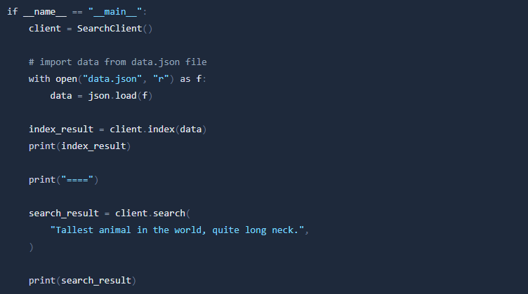 Let's try to read data from the data.json file, process and index it. Then we can try to search and get top 3 results from our Database!