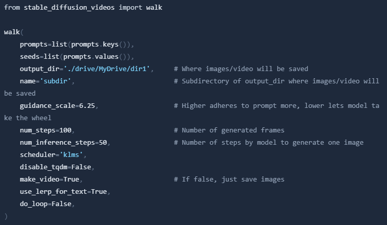 There are some descriptions of parameters, but if you want to know more - check stable_diffusion_videos code! I use 100 steps between prompts, but you can use more for better results. You can also modify num_inference_steps and other parameters. Feel free to experiment! After running this code, you will find the video in your Google Drive. You can download it and watch and share with your friends!